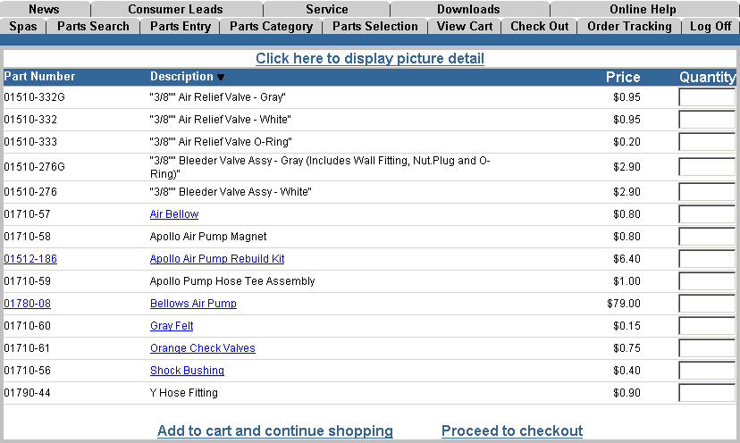 usually blue underlined text. When you are ready, simply enter a quantity in the "Quantity" field for all parts in this category and click "Add to my cart and continue shopping" to return to the Parts Category window to select another category and order additional parts. When you have finished shopping, simply click on "Proceed to checkout" to place your parts order. NOTE: All items in your "shopping cart" will remain their until you place the order, or remove the item(s). This will keep you from having to start all over if you get interrupted before you complete your order. Your order is also kept separately from the order(s) of any other employee on the dealer's authorized buyer list. You can only order "Parts & Accessories" or "Spas" separately. If you want to place an order for a spa, you must place or clear your parts order first. |